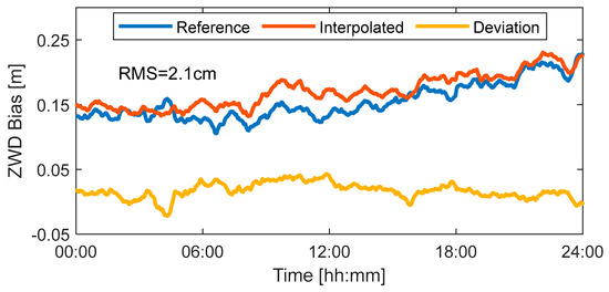 Achieving high-precision regional atmospheric modeling is key to improving the performance of PPP-B2b services. To this end, the accuracy of ZWD and slant ionospheric modeling was evaluated separately. Figure 5 first presents the modeling results of ZWD at user stations. The interpolated values from the model generally align with the reference true values, with modeling errors mostly within the ±5 cm range. The RMS value of ZWD modeling for the entire day was 2.1 cm. Based on this, a constraint variance of 0.09 m2 was selected for ZWD in subsequent experiments.