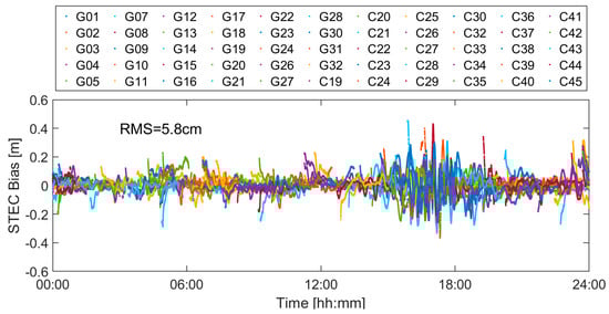 Figure 6 shows the modeling biases of single-difference ionospheric delays for each satellite. It can be observed that the modeling biases for most periods do not exceed 20 cm, with an overall ionospheric modeling accuracy of 5.8 cm. However, it is noteworthy that during certain periods (e.g., 15:00–19:00), the ionospheric modeling biases exhibit significant fluctuations, even exceeding 40 cm. This is primarily related to the temporal variability and activity of the ionosphere.