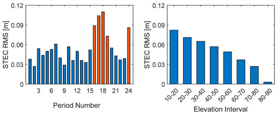 Figure 7 visually summarizes the ionospheric modeling accuracy statistics for different time periods (in 1 h intervals). It shows that the ionospheric modeling accuracy for most periods is better than 6 cm. However, during the 15:00–19:00 period and the final period (orange bars in the figure), the ionospheric modeling accuracy noticeably deteriorates, even exceeding 10 cm. Accurately characterizing the precision of ionospheric enhancement information is essential for achieving rapid and accurate parameter estimation at the user end. Therefore, it is necessary to adjust the stochastic model for ionospheric enhancement information based on different time periods. Additionally, ionospheric modeling accuracy is often strongly correlated with satellite elevation. As shown in Figure 7, satellites at low elevations tend to exhibit larger modeling errors.