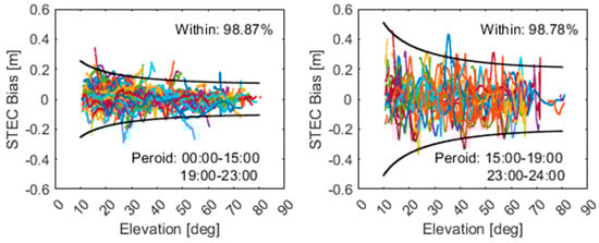 Based on the above analysis and the stochastic model described in Equation (25), different prior variances were set for different time periods: was used for normal periods, and was adopted for periods with poor modeling accuracy. Using the above stochastic model, Figure 8 illustrates the error envelope effects under two different threshold settings. It can be visually observed that, except for a very few satellites, the constructed stochastic model effectively envelopes the ionospheric modeling errors. The percentages of modeling errors falling within the envelope reached 98.87% and 98.78%, respectively. Overall, the model successfully characterizes the uncertainty of ionospheric enhancement information, providing a reliable reference for integrating enhancement information at the user end.