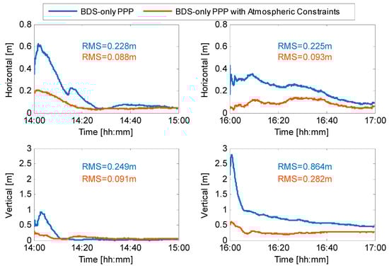 BDS-3-only kinematic PPP results before and after applying atmospheric constraints (left: 14:00–15:00; right: 16:00–17:00).