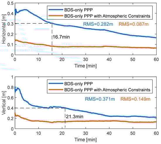 By integrating the results from all 24 arcs of the day, the average positioning results are shown in Figure 10. A similar trend is observed: after applying atmospheric constraints, the convergence performance in both the horizontal and vertical directions was significantly improved. Using thresholds of 30 cm for horizontal and 40 cm for vertical accuracy [35,36], the standard single-system BDS-3 PPP-B2b required an average convergence time of approximately 16.7 min and 21.3 min, respectively. In contrast, with atmospheric constraints, the convergence thresholds were met from the first epoch, and subsequent epochs maintained continuous and stable positioning results. Within the 1 h arc, the horizontal and vertical positioning accuracy of single-system BDS-3 PPP-B2b improved from (0.282, 0.371) m to (0.087, 0.149) m, representing improvements of 69.3% and 59.9%, respectively.