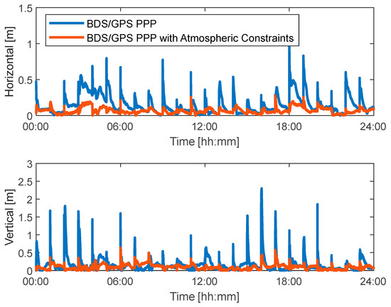Based on kinematic PPP mode, the positioning performance of BDS-3-only PPP-B2b was first analyzed. Corresponding to the two observation scenarios with high and low ionospheric modeling accuracy in Figure 7, two time periods (14:00–15:00 and 16:00–17:00) were selected as examples. Figure 9 shows the positioning results before and after applying atmospheric constraints. Atmospheric constraints significantly accelerated the convergence speed, achieving decimeter-level positioning from the first epoch. During the 14:00–15:00 period, the horizontal and vertical accuracy improved from (0.228, 0.249) m to (0.088, 0.091) m, representing improvements of 61.4% and 63.5%, respectively. During the 16:00–17:00 period, the horizontal and vertical accuracy improved from (0.225, 0.864) m to (0.093, 0.282) m, representing improvements of 58.7% and 67.4%, respectively. Furthermore, influenced by ionospheric activity, the vertical positioning accuracy during the 16:00–17:00 period was noticeably lower than the other period.