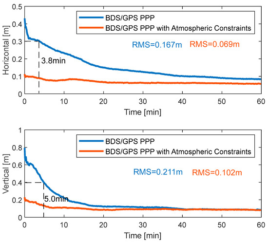 Table 2 further provides statistics on positioning accuracy under different convergence durations. With atmospheric constraints, positioning accuracy better than 0.15 m horizontally and 0.3 m vertically was typically achieved within 1 min, with improvements of approximately 50–70% in both horizontal and vertical accuracy.