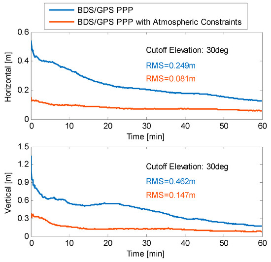 To further explore the benefits of high-precision atmospheric constraints for standard PPP-B2b services under observation-constrained scenarios, Figure 13 shows the positioning results with a cutoff elevation of 30 degrees. Although the positioning performance degraded under high cutoff elevation conditions, similar conclusions can be drawn: regional atmospheric enhancement still enabled rapid high-precision positioning. The average accuracy from the first epoch was better than 0.2 m horizontally and 0.4 m vertically. Throughout the entire period, the average horizontal and vertical positioning accuracy improved from (0.249, 0.462) m to (0.081, 0.147) m, representing improvements of 67.5% and 68.2%, respectively.