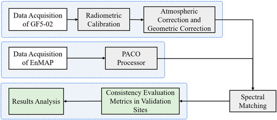 In recent years, multi-source hyperspectral data have played an increasingly important role in applications such as environmental monitoring, precision agriculture, and geological exploration [1,2,3]. With their continuous narrow bands, high spectral resolution, and relatively fine spatial resolution, hyperspectral sensors provide rich spectral information that supports both quantitative inversion and qualitative identification of land surface features. However, variations in spectral response functions, radiometric calibration accuracy, and atmospheric correction procedures across different satellite platforms and sensors introduce inconsistencies, which in turn affect cross-sensor data fusion and joint applications. Therefore, evaluating the consistency of multi-source hyperspectral data is essential for ensuring interoperability, improving quantitative retrieval accuracy, and enhancing the comparability of derived products [4,5].