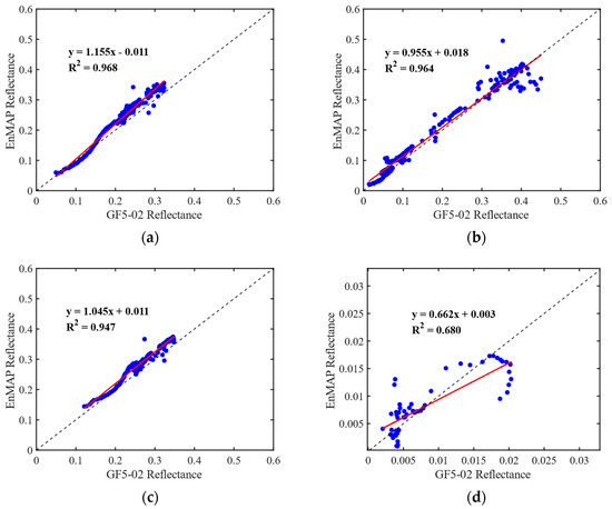 Scatter plots of surface reflectance between GF5-02 AHSI and EnMAP for four representative scenes: (a) Eastern Tianshan, (b) Danzhou grassland, (c) Dunhuang desert, and (d) Qinghai water body. Each comparison is based on 30 spectrally homogeneous subregions (3 × 3 pixels) selected from the corresponding EnMAP and GF5-02 images. Blue dots represent the reflectance scatter points, the red line indicates the least-squares fitted line, and the black dashed line denotes the 1:1 reference line.