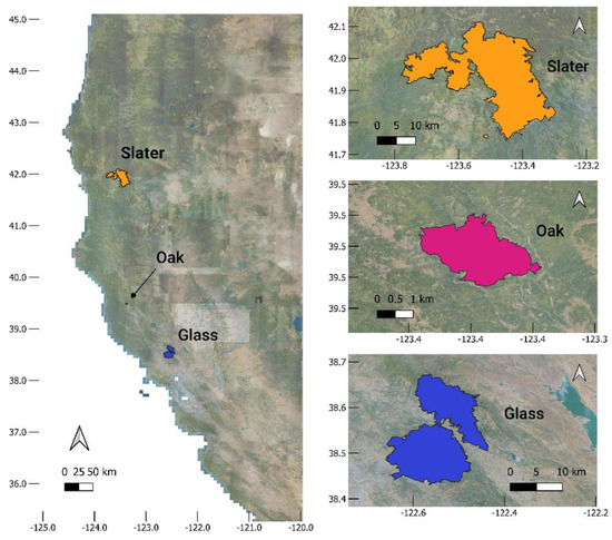 A subset of fires was selected for analysis based on either the availability of high temporal resolution observations or a request from Cal Fire to investigate their behavior. The selected fires were the Glass, Oak, and Slater fires. Images acquired during six flights over the Glass fire and five flights over the Oak fire were used to develop the active fire edge contouring method, as they provide a good representation of image diversity. Meanwhile, three Oak and one Slater fire flight were used to assess the automated method performance. Figure 1 shows the locations of these fires and their final perimeters as reported in the California historical fire perimeters database [28].