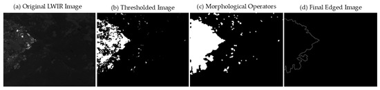 The threshold mask from Equation (3) was applied to the Gaussian smoothed image. Afterwards, two filling functions were used to fill the fire area followed by two iterations of dilation and another filling operation. This ensures there is only a single edge inside the fire area when edge detection is applied, otherwise multiple edges may be detected. Erosion was then applied to reduce any part of the fire area that protruded from the perimeter or any rogue non-fire pixels scattered throughout the frame. Dilation and erosion transformations were applied using a 5 × 5 matrix. Finally, canny edge detection was performed with an upper threshold value of 4.4 and a lower threshold of any value < 4.4. Edges smaller than 250 pixels were removed. Multiple sequences of the morphological operations were tested where the operations were interchanged. Other sequences failed to provide satisfactory results because they either left holes inside the segmented images that were distinguished as false edges, created edges extending beyond the active fire perimeter, or maintained non-continuous points along the fire edge. Figure 3 illustrates the results after each processing step, which include thresholding according to Equation (3), morphological operators, and canny edge detection. It can be seen in Figure 3b that morphological operations are necessary to transition from discrete active fire edges around the fire area to a continuous edge more adequate for running edge detection. The final output image provides a sharp continuous line around the active fire edge.