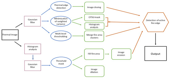 - Valero, M.M.; Rios, O.; Planas, E.; Pastor, E. Automated location of active fire perimeters in aerial infrared imaging using unsupervised edge detectors. Int. J. Wildland Fire 2018, 27, 241–256. [Google Scholar] [CrossRef]