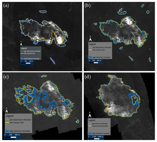Figure 9 shows a comparison between the semi-automated edge detection method applied to image mosaics, the resulting concave hull polygon, and the manually annotated fire perimeter for the four analyzed flights. Generally good agreement can be observed between the automated method and manual annotations of the main fire geometry in Figure 9a,b,d, and a poorer agreement in Figure 9c. The automated method visually performed best for the Slater fire flight (Figure 9d). With the use of the polygonize or concave hull, the active fire edge provides a smoother active perimeter compared to the hand-drawn perimeter, but still captures the fire geometry (shape and size). Over areas of higher fire intensity where the gradient is stronger, the automated and manual edges are analogous, but in areas where small fingers of fire extend from the fire area, and areas where smoke is present, they have shown to be problematic.