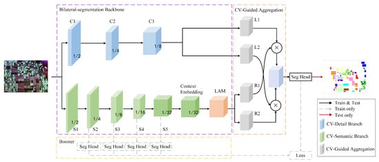Overview of the LAM-CV-BiSeNetV2. This mainly includes three parts: the bilateral-segmentation backbone, the CV-guided aggregation layer, and the booster part. The black solid line paths represent usage during both training and validation, the gray dashed line paths indicate usage only during training, and the red solid line paths denote usage only during validation.