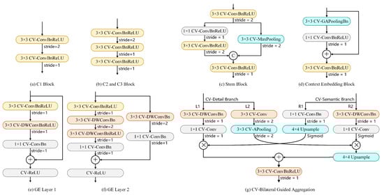 Components of LAM-CV-BiSeNetV2: (a) Structure of C1 block; (b) Structure of the C2 and C3 blocks; (c) Structure of Stem Block; (d) Structure of Context Embedding Block; (e) Structure of GE Layer 1; (f) Structure of GE Layer 2; (g) Structure of CV-Bilateral Guided Aggregation.