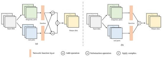 Firstly, some symbols in the formula are defined. The ith complex input feature map is denoted as , where I is the number of complex input feature channels. The jth complex output feature map is marked as and J is the count of complex output feature channels. The position of pixels in the feature map is recorded as and the pixel coordinates in each convolution kernel are denoted as . Then, the specific announcement and explanation are as follows.