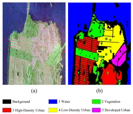 The third L-band full polarimetric San Francisco dataset was acquired by the AIRSAR airborne platform in 2008. There are five categories of objectives, namely water, vegetation, high-density urban, low-density urban, and developed urban. The pseudo color image formed by Pauli decomposition in size of 1800 × 1380 is shown in Figure 7a. The ground truth is shown in Figure 7b, where the black areas are regarded as the background.