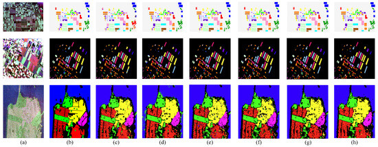 The second L-band full polarimetric Flevoland dataset was acquired by the AIRSAR airborne platform in 1991. There are 14 types of land covers in total, namely potatoes, fruit, oats, beet, barley, onions, wheat, beans, peas, maize, flax, rapeseed, grass, and lucerne. The pseudo color image obtained by Pauli decomposition in size of 1024 × 900 is shown in Figure 6a. The ground truth is presented in Figure 6b, where the black regions are regarded as the background.