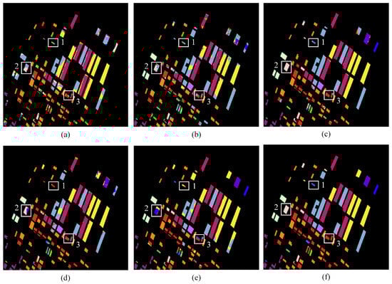 Segmentation results of Flevoland dataset 2: (a) FCN; (b) U-Net; (c) DeepLabV3+; (d) ICNet; (e) BiSeNetV2; (f) LAM-CV-BiSeNetV2. The numbers 1–3 indicate representative regions for detailed comparison: (1) the onions region; (2) the grass region; (3) the beet region.
