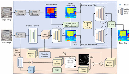 Stereo matching estimates disparity from rectified image pairs to recover three-dimensional geometry and is widely used in remote sensing for generating DSMs or point clouds, providing essential data for urban modeling, mapping, and disaster monitoring [1,2,3]. In recent years, cost-volume–based approaches built upon convolutional neural networks (CNNs) have achieved remarkable progress in stereo matching tasks, where feature extraction, matching cost computation, regularization, and disparity regression are jointly optimized [4,5,6]. However, under ill-posed conditions such as geometric inconsistencies, radiometric differences, and temporal variations in cross-orbit satellite remote sensing scenarios, the stability and accuracy of current disparity estimation algorithms remain difficult to guarantee.