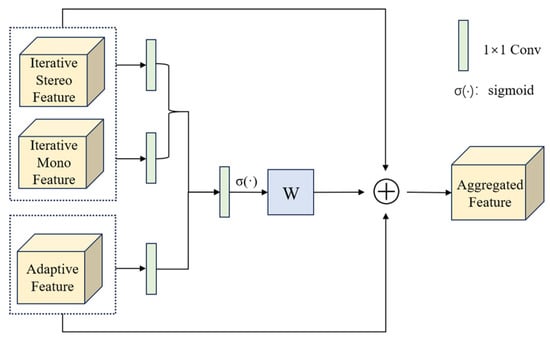 As shown in Figure 4, Adaptive Perceptual and Geometry Fusion (APGF) employs an adaptive weighting mechanism to effectively integrate the aware feature FA with the monocular and stereo geometric features (FS, FM). Specifically, a 1 × 1 convolutional projection layer first maps the aware and geometric features into a shared feature space, ensuring dimensional alignment and preserving key information. The projected features are then concatenated along the channel dimension and passed through a fusion layer to produce the fused representation. Finally, a convolutional attention weighting layer, followed by Sigmoid activation, generates a pixel-wise weight map W, which adaptively balances the contributions of aware and geometric features.