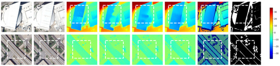 Visualization of experiments based on the US3D dataset. For clarity, selected regions of the disparity maps have been cropped and enlarged. From left to right, the results correspond to the methods listed in Table 7 from top to bottom, followed by ours, the ground truth, and the ill-posed mask.