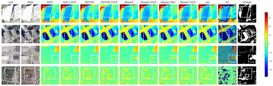 In this subsection, we evaluate the proposed method on the US3D dataset and compare it with several representative stereo matching networks, including classical stereo matching networks such as PSMNet [12], CFNet [10], GWCNet [11], MSNet3D [46], Stereobase [47], IGEV [14], which represent different cost aggregation and feature extraction strategies, as well as stereo matching networks augmented with monocular depth information, namely DEFOMStereo [35], Monster [36]. To ensure a fair evaluation, we strictly follow the publicly available experimental setup, using images from the Jacksonville region for training and reserving images from the Omaha region, which are not included in training, for testing, thereby comprehensively assessing the model’s generalization capability in complex remote sensing scenarios.
