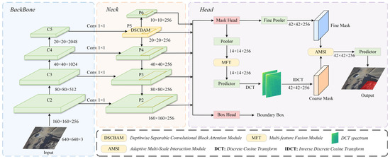 Due to the strong randomness and spatial heterogeneity of building damage in drone imagery [24], traditional semantic segmentation methods often struggle to maintain consistency in building instances, potentially dividing the same building into multiple damage categories, leading to inaccurate identification of individual building boundaries. As a result, recent research on post-earthquake building extraction has increasingly shifted towards instance segmentation methods [25,26] to improve boundary precision and category accuracy. Zhan et al. [27] improved the classic Mask R-CNN [16] to extract post-disaster damaged buildings. This method classifies damaged buildings into four categories: undamaged, slightly damaged, severely damaged, and collapsed. It achieves an accuracy rate of 92% in identifying severely damaged buildings, with an overall classification accuracy rate of roughly 88% across the four damage categories. However, as image resolution increases, training complexity grows exponentially. To mitigate computational overhead in building instance segmentation for high-resolution remote sensing images, Shen et al. [28] proposed DCT-Mask based on Mask R-CNN. This network uses a 300-dimensional Discrete Cosine Transform (DCT) vector to represent a 128 × 128 mask, achieving significant performance improvements. Nevertheless, each pixel value in the mask is determined by the entire DCT vector, and modifying part of the vector affects the global structure, potentially disrupting correctly segmented regions. To weaken this global coupling and further optimise segmentation boundaries, Wen et al. [29] proposed PatchDCT. This method disaggregates the mask derived from the DCT vector into several patches and enhances each patch utilising a specified classifier and regressor. The classifier identifies mixed, foreground, and background patches, and can rectify misclassified foreground and background patches from the initial DCT approach. Conversely, the regressor facilitates DCT vector prediction for mixed patches, hence enhancing the segmentation quality of boundary points. However, the aforementioned methods lack a targeted multi-scale feature fusion mechanism, leading to coarse boundaries during decoding and a significant performance decline in the extremely complex post-earthquake scenario.