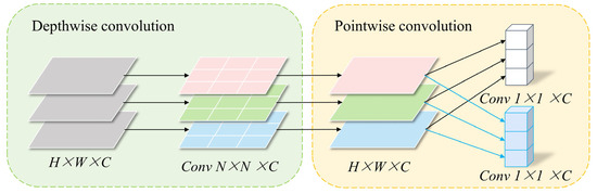 The DSCBAM module structure is shown in Figure 4b, which includes a Channel Attention and a Spatial Attention. The channel attention module aims to model the interdependencies between channels in feature maps, automatically assigning weights to enhance focus on key features relevant to the current task. To capture richer contextual information, this module employs adaptive pooling operations, including 1 × 1 and 2 × 2 adaptive average pooling and max pooling, and fuses the resulting features. To further improve efficiency, the module replaces the traditional multi-layer perceptron (MLP) with a depthwise separable one-dimensional convolution structure, significantly reducing computational complexity. As shown in Figure 5, the depthwise separable convolution [36] first performs depthwise convolution on the input features to extract local features within each channel, then uses pointwise convolution (1 × 1) to facilitate information exchange between channels. This structure not only simulates the nonlinear transformation and feature fusion functions of the MLP but also markedly decreases the parameter count and computational complexity. After pooling, the feature vectors are reduced in dimension and fused through a linear adapter to generate a 256-dimensional feature vector. The ultimate channel attention weights are derived utilising the sigmoid activation function, and thereafter employed to reconfigure the original feature map.