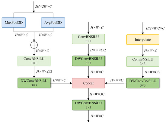 The structure of the MFT module is shown in Figure 6. Specifically, we first upscale the input features (w × h) to a higher spatial resolution (2w × 2h) via bilinear interpolation, while downsampling them by a factor of 0.5 to obtain a low-resolution version (0.5 w × 0.5 h). The three features of different scales undergo independent nonlinear transformations. The high spatial resolution branch employs max pooling and average pooling to compress feature maps spatially, thereby aggregating global information. Subsequently, to avoid the computational burden of large convolutional kernels, we utilise 1 × 1 convolutions to efficiently facilitate inter-channel feature interaction and dimensionality reduction. The remaining two branches both employ 3 × 3 convolutions to extract local spatial features.