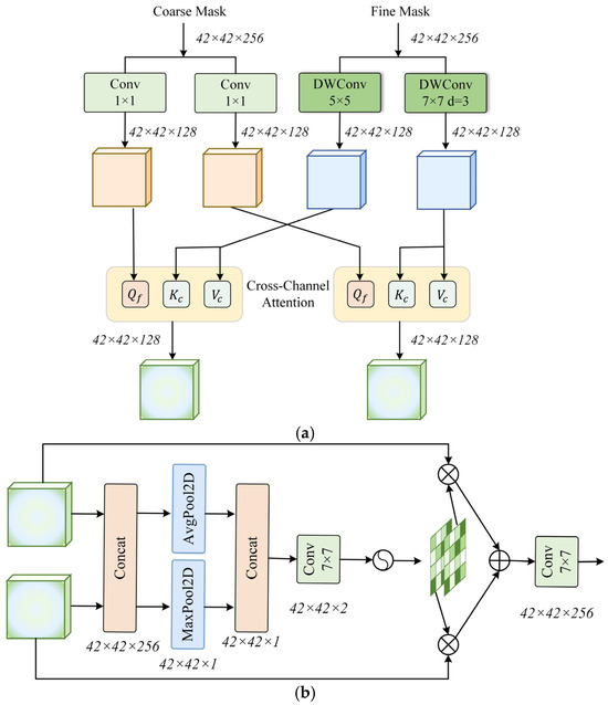 To address this issue, we designed an AMSI module to replace simple additive fusion with a more expressive interaction mechanism. Unlike methods that rely on actual frequency transformations, AMSI simulates multi-scale feature responses by applying convolutional kernels with different receptive fields. Specifically, as shown in Figure 7a, the Spatial Convolution Module (SCM) decomposes fine-grained feature maps into two parallel branches: one branch uses small convolutional kernels to emphasise local textures, while the other branch uses dilated convolutions to capture broader semantic context. Although no explicit frequency transformation is performed, this decomposition simulates the behaviour of high-frequency and low-frequency responses in the spatial domain. Concurrently, lightweight 1 × 1 convolutions convert the coarse-grained mask features obtained via DCT into query embeddings. Two cross-attention branches are then applied, enabling the coarse-grained features to query the two fine-grained branches, thereby achieving adaptive alignment between structure and detail. Finally, the Selective Feature Fusion (SFF) module dynamically merges the two attention outputs based on learned spatial attention weights. The fused features are added back to the fine-grained features via residual connections and passed to the downstream prediction layer. The SFF module structure is shown in Figure 7b. The AMSI module design achieves content-aware multi-level fusion, respecting the complementarity between structure and detail, enhancing the model’s ability to analyse irregular boundaries and maintain semantic consistency, particularly in complex post-disaster scenarios.