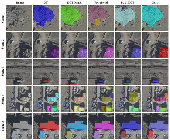 All four models were able to accurately locate post-earthquake buildings, but they varied in the precision of their segmentation boundaries and their adaptability to complex scenes. DCT-Mask and PointRend showed poor segmentation capability for multiple buildings, failing to distinguish well between adjacent structures in Scene 4. This exposes their deficiencies in global context awareness and in modelling relationships between instances. Although PointRend uses iterative refinement for points with high uncertainty, its sampling strategy may not effectively decouple the boundaries of different instances in dense regions. Meanwhile, DCT-Mask, which applies global DCT encoding to the entire instance, struggles to handle the fine gaps between instances. PatchDCT was unable to effectively fuse fine and coarse features, resulting in very poor recognition of damaged building boundaries, especially for the ruins of completely collapsed buildings, with obvious omissions seen in Scene 1.