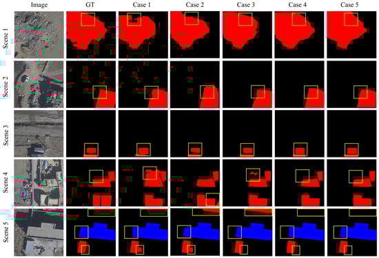 In Table 3, the experimental results demonstrate that model performance improved incrementally as modules were added. Moreover, the DSCBAM module achieves higher accuracy and faster FPS than the CBAM module. Figure 9 and Figure 10 visualise the segmentation results of the five experiments, showing the impact of adding different modules to the baseline model. The visual comparison between Case 2 and Case 3 demonstrates that the attention mechanism enables the model to focus more on architecture-related features, thereby enhancing localisation accuracy and reducing false negatives and false positives. The improved DSCBAM module exhibits superior performance. Case 4 shows that the MFT module enhances the model’s ability to localise the boundaries of buildings at different scales, proving its role in improving global contextual consistency and local detail precision. The results for Case 5 reflect that the AMSI module respects the complementary nature of structure and detail, enhancing the model’s ability to resolve irregular boundaries and maintain semantic consistency. These results prove that each proposed module improves performance to same extent, and that their contributions are not merely additive; their integration further improves performance.
