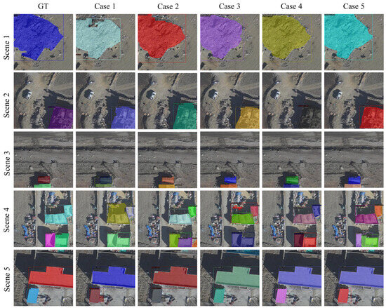 To systematically analyse the independent contributions of the three core components within UEBNet, we designed four five sets of ablation studies. By strategically disabling specific functional modules within the complete framework, we were able to quantify the key roles played by DSCBAM, MFT, and AMSI in the post-earthquake building recognition task. Moreover, we have specifically compared the CBAM module with the enhanced DSCBAM module to demonstrate the efficacy and necessity of our improvements. The experimental configurations and results are shown in Table 3, where ‘DS’ refers to the DSCBAM module, is the segmentation precision for the Damaged class, and is the segmentation precision for the Intact class. The ablation study began with a baseline architecture (Case 1), which represents a simplified version of UEBNet with all core enhancement modules removed. In this configuration, the model retained only the ResNet, a standard FPN, and the basic head of PatchDCT, using the original FPN features directly for candidate region generation and a simple element-wise addition to fuse coarse and fine masks. Subsequently, we progressively ‘re-activated’ UEBNet’s built-in components: Case 2 reintegrated the CBAM module at the top layer of the FPN. Case 3 replaced the CBAM module with the DSCBAM module. Building on this, Case 4 further enabled the MFT module within the mask head. Case 5 represented the complete UEBNet framework, with all three core components working in synergy.