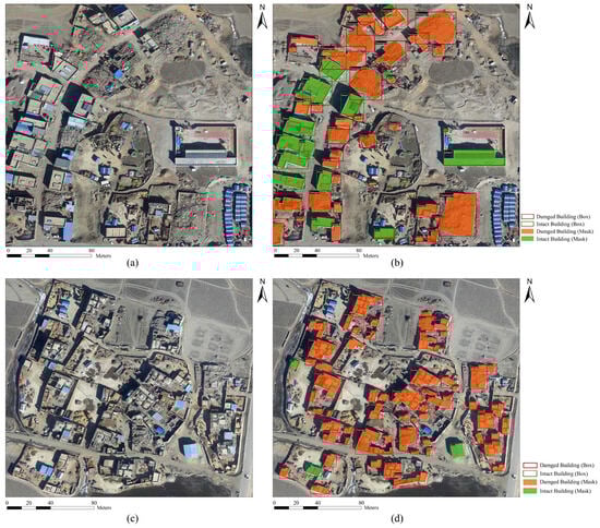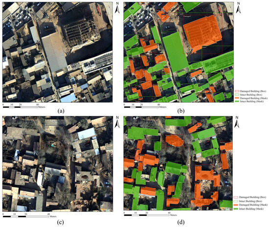 In total, we annotated 790 images, comprising 1929 damaged buildings and 199 intact buildings. Due to the significant difference in sample sizes between classes, focal loss was adopted in the model to balance the categories. Considering the small scale of the dataset, we employed K-fold cross-validation [33,34]. The training set consisted of 553 images, the validation set included 158 images, and the test set contained 79 images. Detailed information about the post-earthquake building dataset is provided in Table 1. Figure 2 shows sample instances from the dataset.
