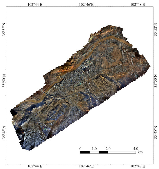 In practical applications, the generalisation capability of a post-earthquake building extraction model is crucial. To evaluate the generalisation performance of the proposed UEBNet, we conducted tests using UAV imagery (resolution: 0.14 m) of Dahejia Town, captured after the Ms 6.2 Jishishan earthquake in Gansu Province, China, on 18 December 2023. As shown in Figure 12, we collected data from this region to be used for model training and evaluation. Figure 13 shows sample instances from the dataset.