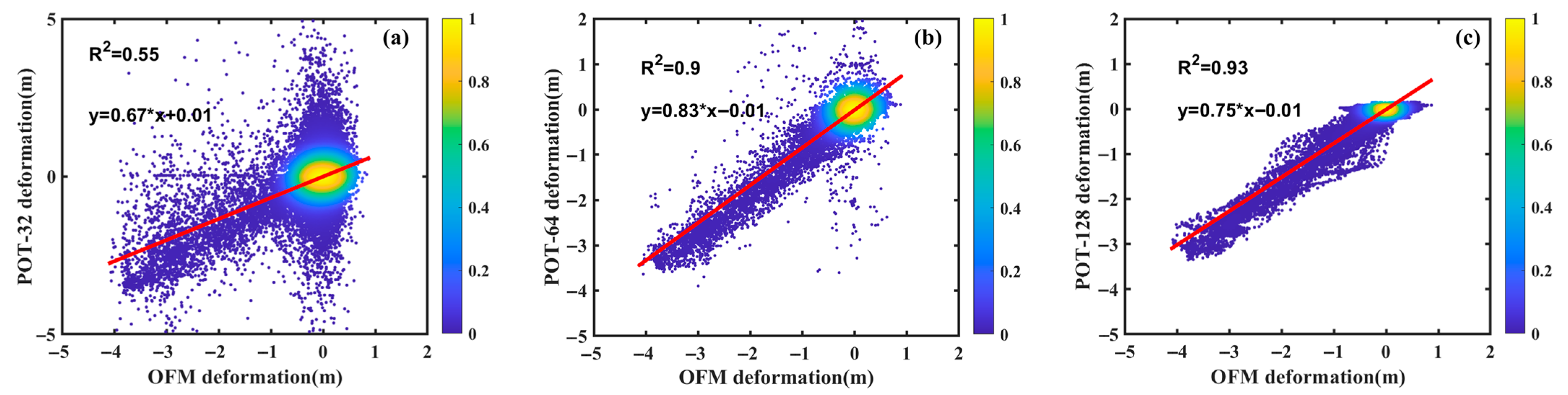 5.1. Performance Comparison of InSAR, POT, and OFM in Mining Displacement Monitoring