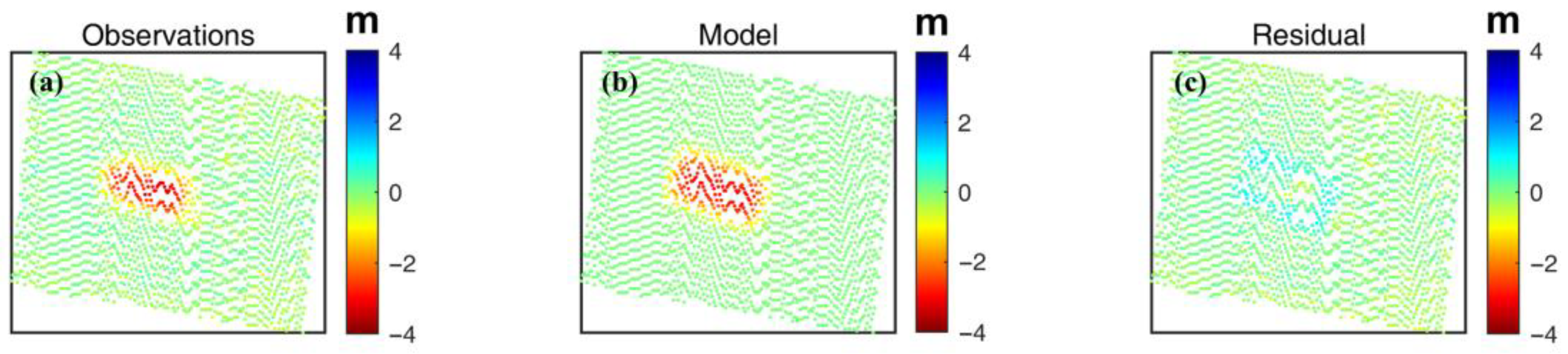 - Wang, L.; Deng, K.; Zheng, M. Research on ground deformation monitoring method in mining areas using the probability integral model fusion D-InSAR, sub-band InSAR and offset-tracking. Int. J. Appl. Earth Obs. Geoinf. 2020, 85, 101981. [Google Scholar] [CrossRef]