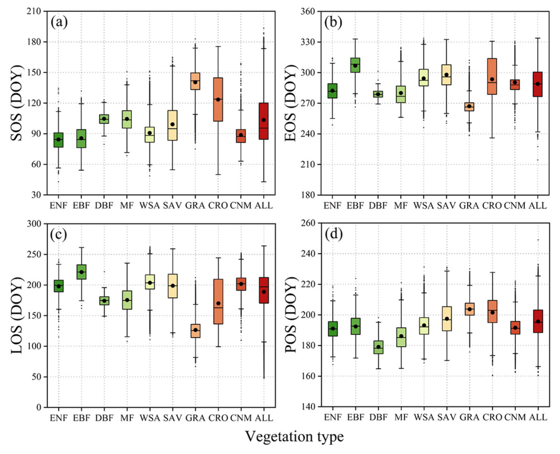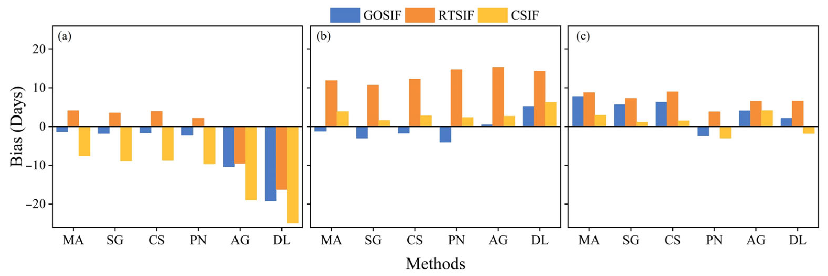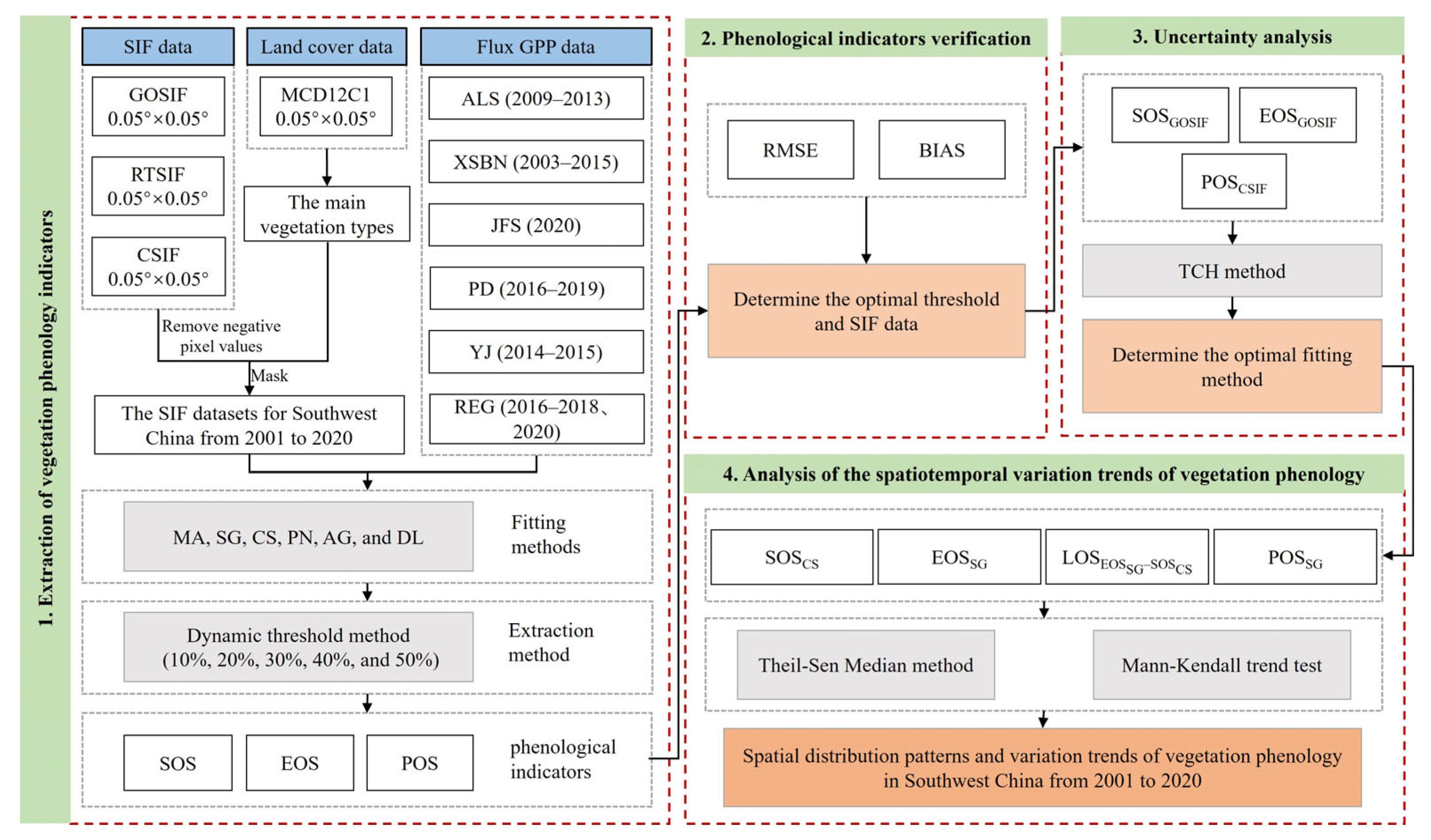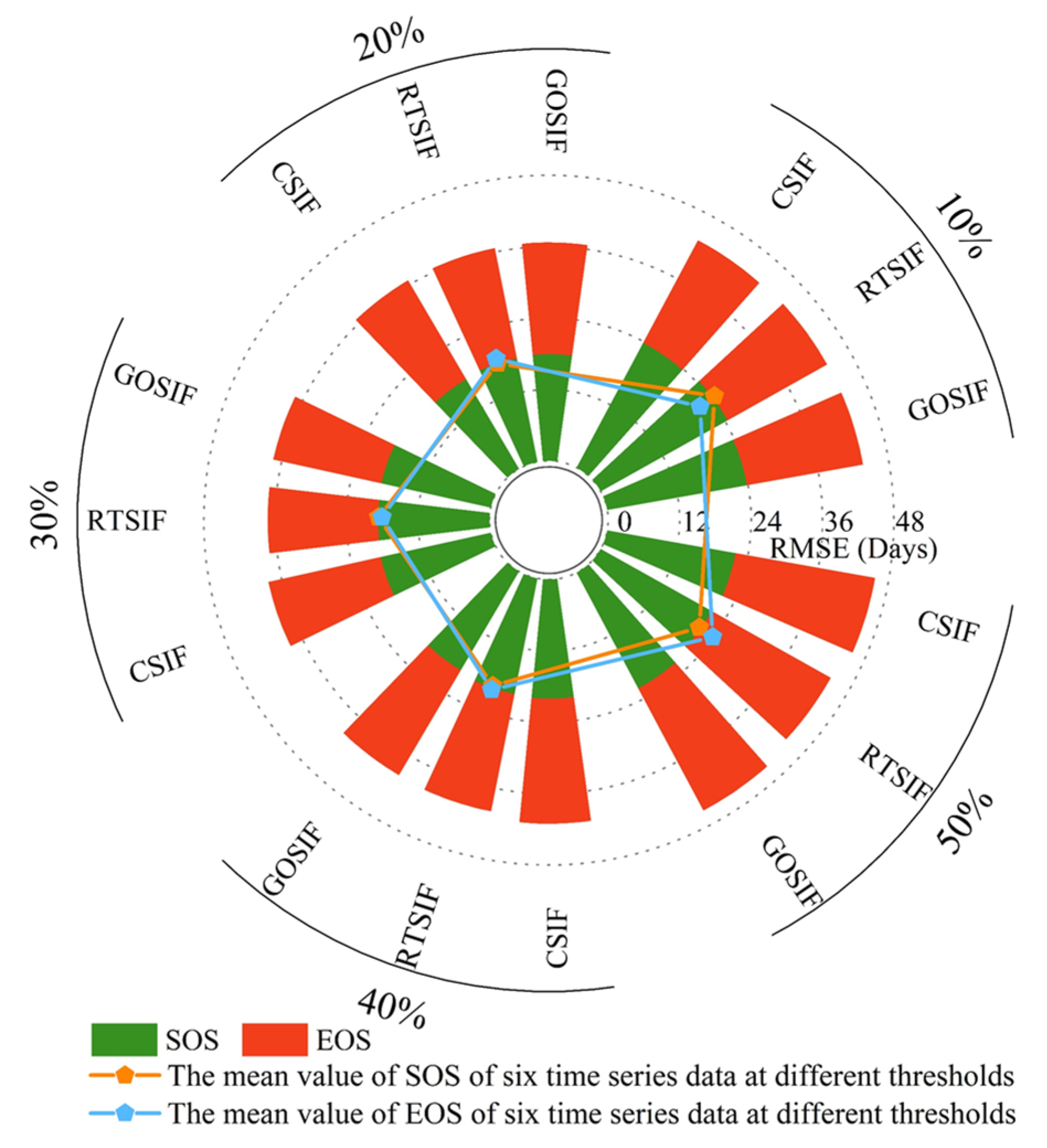 - In the selection of thresholds and SIF datasets, the optimal combination for extracting SOS is the 20% threshold and GOSIF, for extracting EOS, it is the 30% threshold and GOSIF, and the optimal dataset for extracting POS is CSIF.