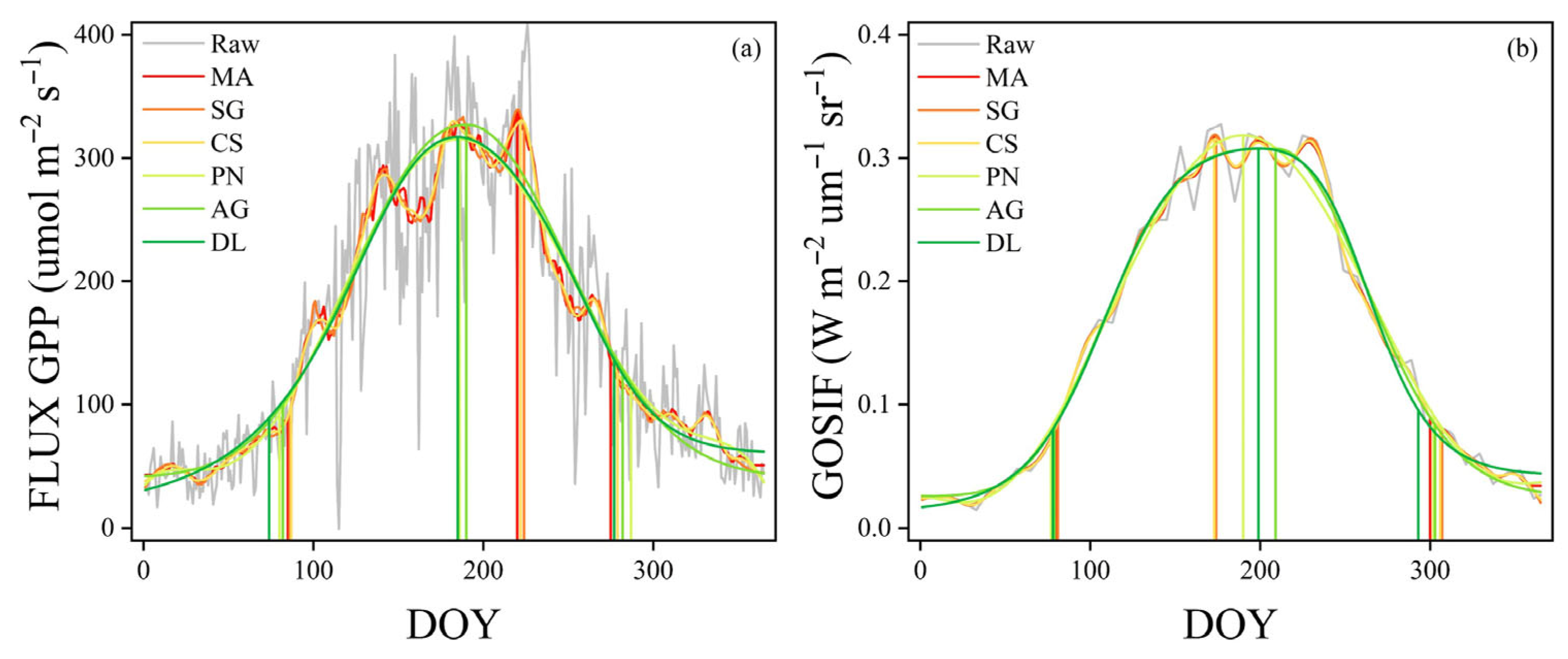 - Ge, Z.; Huang, J.; Wang, X.; Zhao, Y.; Tang, X.; Zhou, Y.; Lai, P.; Hao, B.; Ma, M. Using Remote Sensing to Identify the Peak of the Growing Season at Globally-Distributed Flux Sites: A Comparison of Models, Sensors, and Biomes. Agric. For. Meteorol. 2021, 307, 108489. [Google Scholar] [CrossRef]