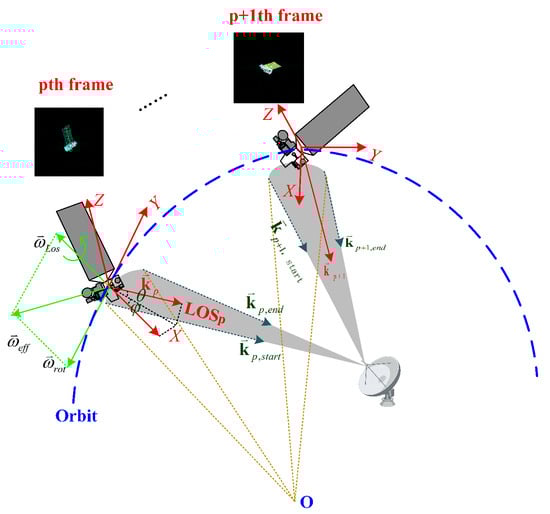 where and denote self-rotation angular velocity and the intersection direction between the start and end LOS vector in an imaging frame, such as