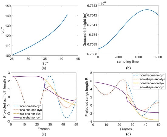 ISAR sequential shape changes in different dynamics. The nor- sha-ano-dyn denotes the targets with anomalous dynamics but have a normal shape. The ano-sha-ano-dyn denotes the targets with anomalous dynamics and have an abnormal shape. The nor-sha-nor-dyn denotes the targets that have normal shape and normal dynamics. The ano-sha-nor-dyn denotes the targets which are of abnormal shape but have normal dynamics. (a) Longitude vs Latitude; (b) Geocentric height of the space target (target to the earth’s core); (c) Projected azimuth length change in different shapes and dynamic states; (d) Projected range length change in different shapes and dynamic states.