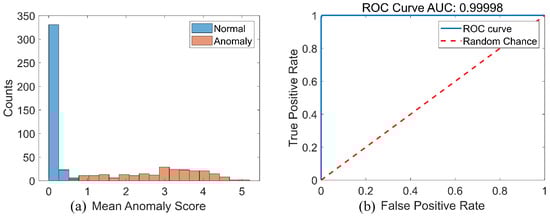 Anomaly score statistics. (a) Histogram of anomaly score; (b) ROC curve of anomaly scores.