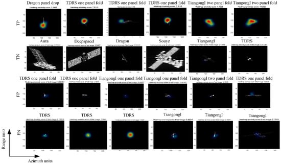 FCDD explanation heatmaps for satellite ISAR images. The first row shows TPs of different targets, the second row illustrates TNs of different targets, the third row shows FP, and the last row gives FN samples.