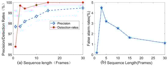 Frame numbers of sequence: It is evident that frame number makes a difference in temporal feature extraction. Therefore, in this subsection, we explore the influence of frame number in the proposed sequential anomaly detection algorithm. Moreover, we expand the dataset above to ensure a more valid evaluation. A training dataset with 10,740 images is constructed by incorporating different oriented attitudes, with 6540 images in normal shapes and the rest being anomalies. The testing dataset has been expanded as well, with 2700 normal images and 3000 anomalies. There are 30 sequences for a circle. To evaluate the influence of frame number, sequences are constructed with 30, 15, 10, 5, 3, and 1 frames per sequence. The precision, detection rates, and false alarm rates are also calculated for an overall evaluation, as shown in Figure 14. It is evident that the improvement of sequential features increases with longer sequences. However, even with 3 frames per sequence, the detection rates have been improved by exploiting the context of sequential ISAR images. To achieve 100% detection and a low false alarm rate of <2%, 15 frames per sequence are recommended. For 5 frames per sequence, the proposal can achieve anomaly detection rates >99% with an FA of almost 3%.