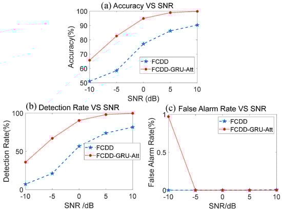 SNR: By adding random Gaussian-distributed noise to the simulated testing dataset above, different ISAR image sequences at varying SNRs are generated. The criteria Prec, Detec, and FA are then used to evaluate the proposal’s performance at different SNRs during testing, as shown in Figure 15. Monte Carlo experiments are performed ten times for each SNR, and the mean values of the criteria are drawn. For comparison, the original FCDD is also performed.