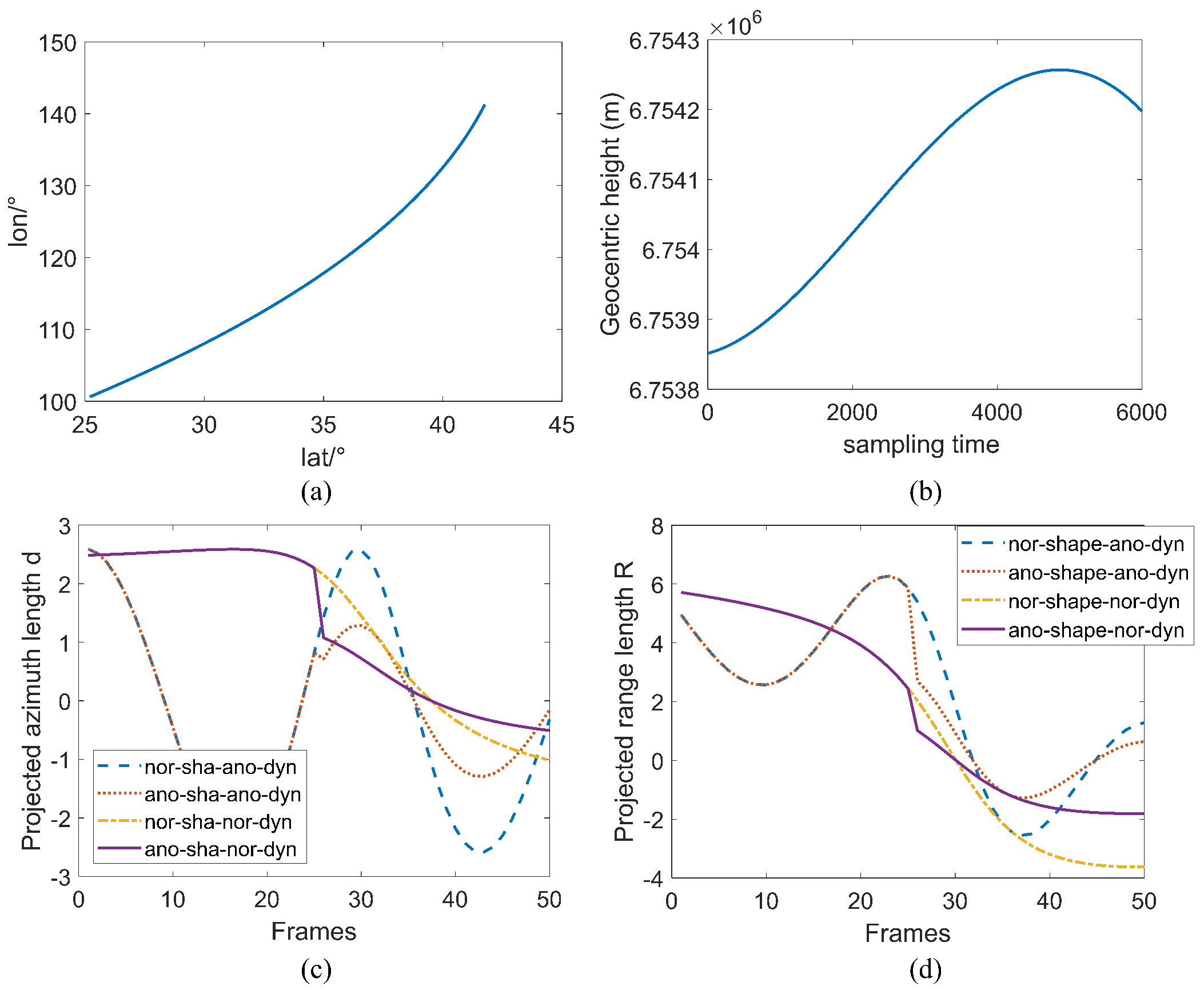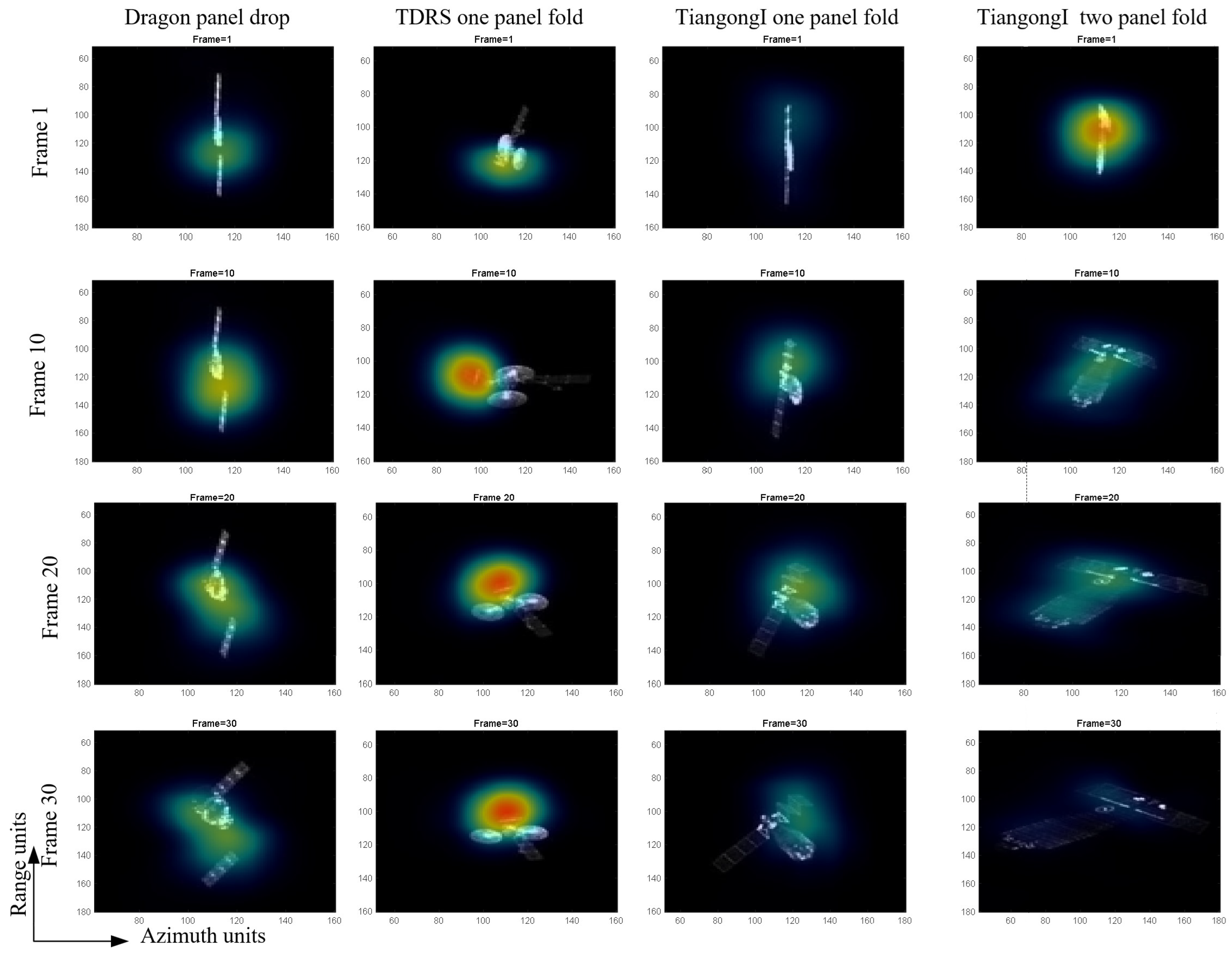 - Generation of different dynamic status: For the diversity of data, we also simulate satellites in a variety of dynamic statuses, including three-axis stability, self-rotation, and attitude adjustment within one frame. The rotation velocity is set as 0.1°/s and 1°/s for the last two statuses. For each orbiting circle, 30 frames of ISAR images with a 10 s interval are generated for sequential shape anomaly detection performance evaluation.