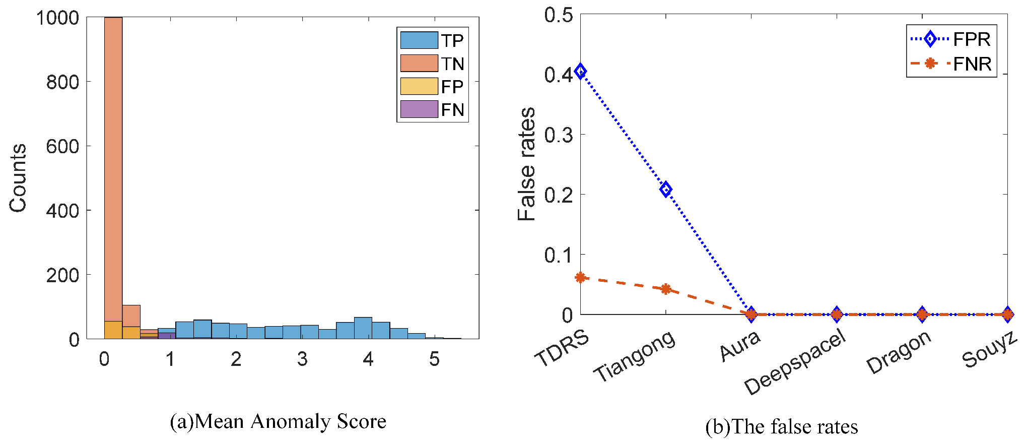 - Evaluate criterion: Same as detection problems, the fundamental criterion for anomaly detection that we care about is the detection capabilities under specific false alarm rates. As a result, overall precision (Prec), detection rates (Detec), and false alarm rates (FA) are computed for quantitative assessments, whose definitions are given asTrue anomalies are denoted as TP, true normal samples as TN, false detected anomalies as FP, and false detected normal samples as FN. For classification, they are the elements of a binary classification confusion matrix.
