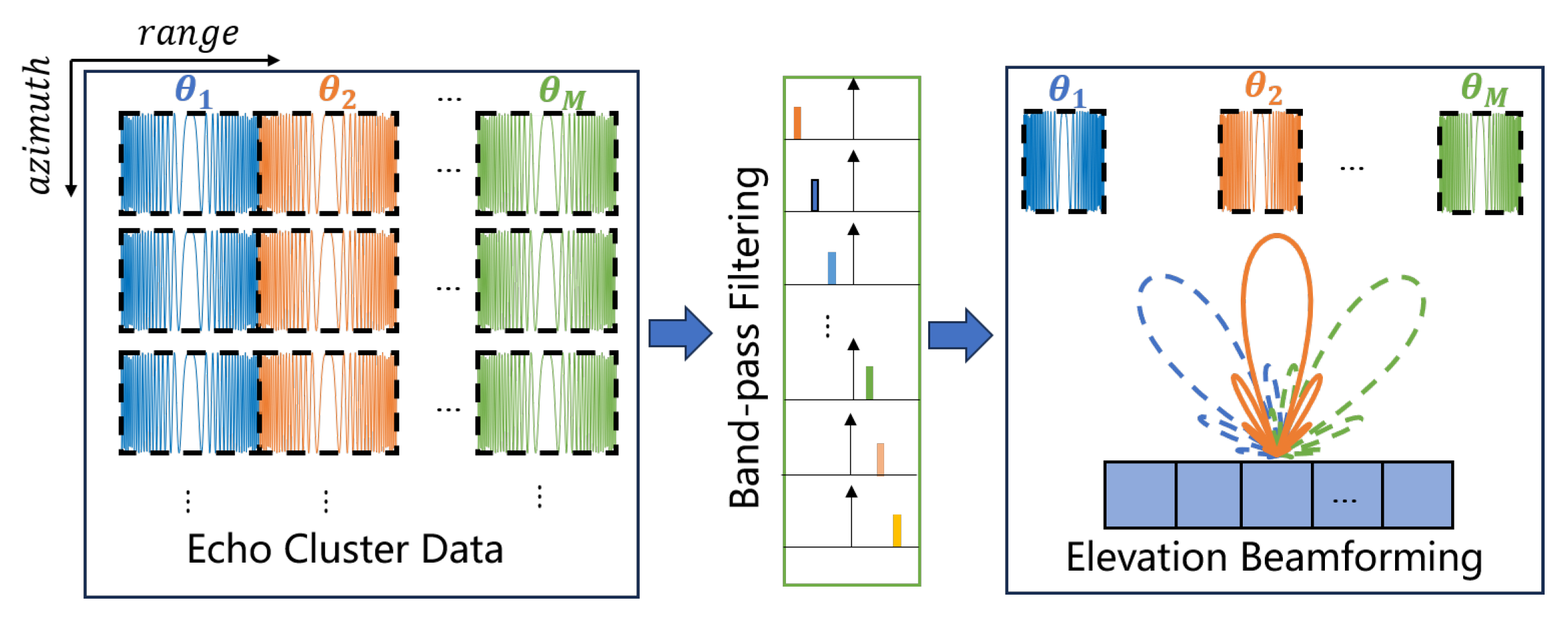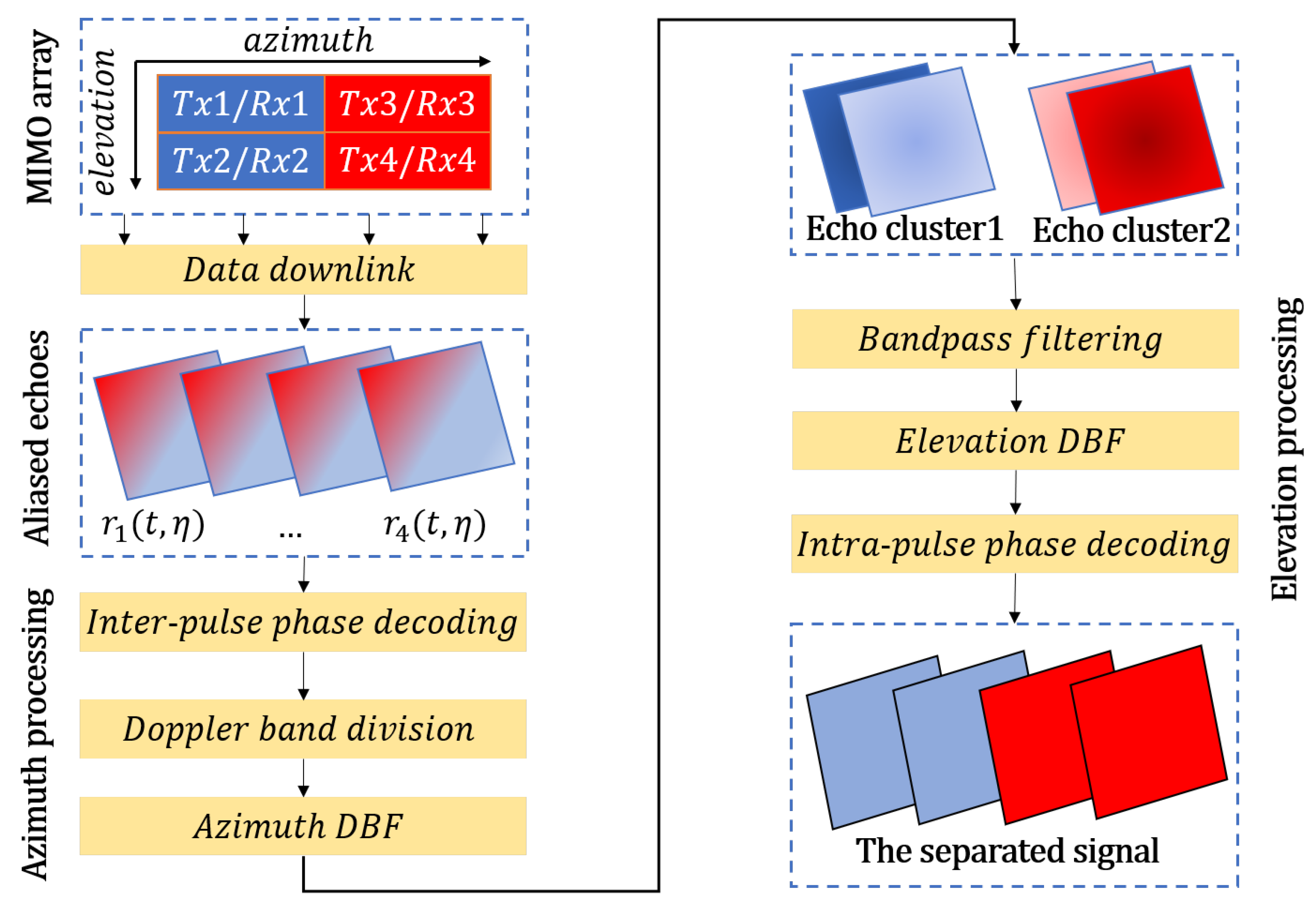 - An azimuth–elevation joint digital beamforming (DBF) processing framework is developed, which significantly reduces system complexity, computational burden, and hardware requirements (e.g., fewer elevation channels and lower PRF) compared to conventional methods.