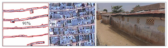Typical satellite view of residential suburbs in urban Kano, showing approximately 91% of the satellite ‘seen’ area occupied by metallic roofing, and a typical street view (Source: Google Earth).