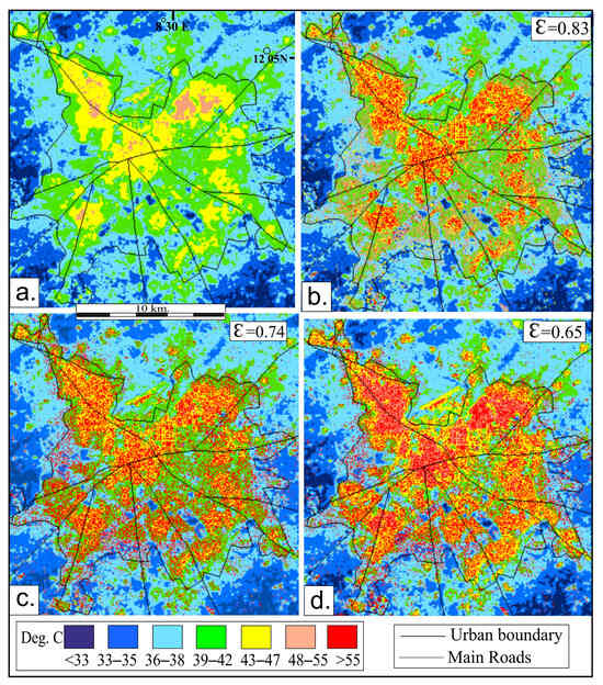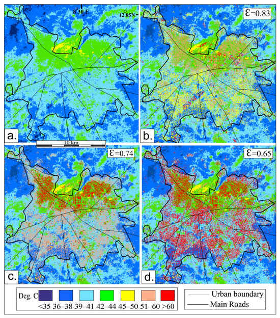 Results for the Landsat thermal infrared image (LST in °C) which was used to allocate different emissivity values to the blue and white metal classes. (a) Same emissivity values as in Landsat LST product: (b) Ɛ = 0.83, (c) Ɛ = 0.74, and (d) Ɛ = 0.65. Image date: 25 September 2022. Image time: 09.43 a.m. The urban area is outlined in black polygon boundary.