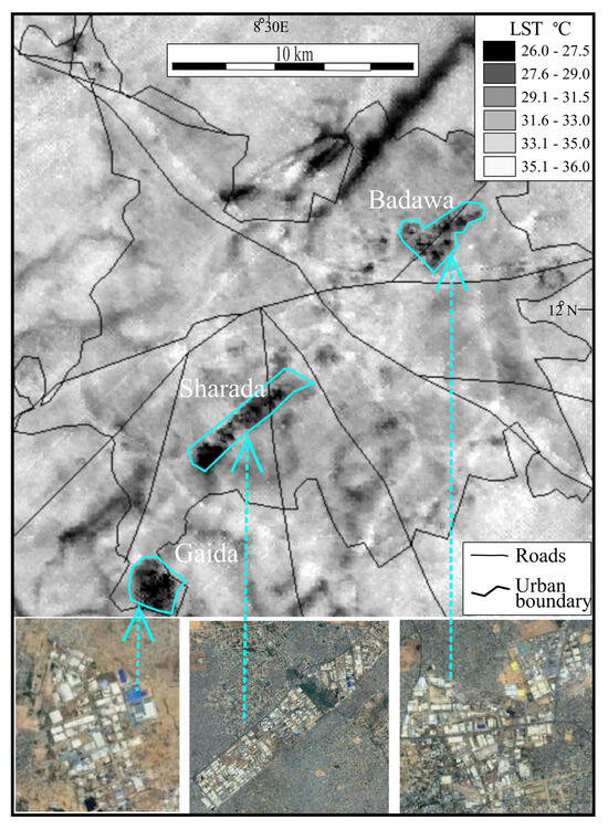 Figure 8 is an ECOSTRESS thermal image showing three major industrial estates in Kano city, which show lower LST values (average of 27.5 °C) than in the rest of the urban area (average of 32.5 °C). These industrial areas have large and consolidated expanses of metal roofing. The average ECOSTRESS emissivity value for these areas is 0.96, which is substantially higher than the values recognized for metal surfaces. This means that the actual LST for these areas may be much higher, i.e., the image LST for the industrial areas is unrepresentatively low.